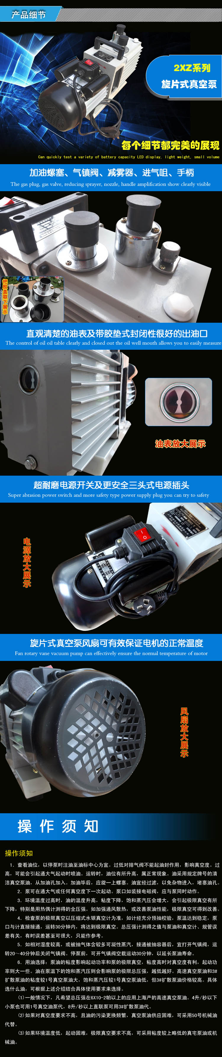該泵裝有氣鎮閥,具有延長泵油使用時間和防止泵油混水的作用,具有體積小、重量輕、噪聲低、起動方便等優點。此外,還有防止返油的措施(2XZ-8)和無防止油封漏油污染場地的措施。